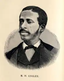 She married her husband Newell Houston Ensley on September 4, 1882, in Boston. Newell, born in Nashville, Tennessee[3] on August 23, 1852, was the son of Clara and George Ensley.[11] Born into slavery, he was owned by his maternal grandfather who hired a teacher to teach him to read and write.[12][lower-alpha 4] After the Civil War, Newell worked and attended a school near her home and became the teacher and a Sunday school teacher. He desired to become a preacher.[12][lower-alpha 5] He graduated third in his class from Roger Williams University in Nashville in June 1878, and then attended Newton Theological Seminary in Massachusetts, where he was the only black man in his graduating class (ca. 1881). He first taught Latin and theology at a school in Raleigh, North Carolina. He was a professor of rhetoric, Hebrew, and science at Howard University and Alcorn State University.[11][12] Among his favored topics were "Toussaint L'Ouverture," "Pluck versus Luck," "The Rights of Women," "Temperance" and "The Rights of the Negro."[12] They had three children: Roger (born 1883), Charlotte (born 1885),[13] and Jean (March 1888 – June 1888).