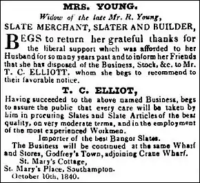 After his 1826 advertisement announcing his relocation, Robert Young had never advertised his business and it had remained small. However, when Thomas Elliott took over the business an advertisement to that effect did appear in the Hampshire Advertiser of 17 October 1840.
