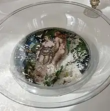 After about the 3rd century Greco-Roman enamelled glass disappears, and there is another long gap in the history of the technique. This is ended in spectacular fashion by a 10th or 11th-century Byzantine bowl in the Treasury of Saint Mark's, Venice. This is of very high quality and shows great confidence in using the technique, which had no doubt been reborrowed from enamel on metal, although Byzantine enamel uses brush painting very little.[16] Some other, technically similar works, one possibly from the same workshop, are also extant.[17]