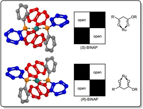 Transition metal catalyzed reductions are subject to the spatial properties of the chiral ligand bound to the metal center that determine the sense and extent of enantioselectivity. A reliable stereochemical model has been developed for reductions employing BINAP ligands.[17] When BINAP chelates to a transition metal such as ruthenium, the phenyl groups attached to phosphorus reside in either pseudoaxial or psudeoequatorial positions. The pseudoequatorial phenyl groups project into the region of space on the other side of the BINAP ligand and influence the preferred binding conformation of chelating ketones (such as α-amino ketones or β-keto esters). The ketone typically occupies the more open regions of space, leading to hydride delivery to a single face of the ketone. The C2 symmetry of the coordination space ensures that only a single face of the ketone will be accessible to the catalyst, no matter in which open region the ketone binds.