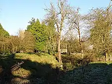The castle was built in the 11th century as a motte and bailey design, although some suggest a later construction date in the early 12th century.[1] The motte lay at the centre of two concentric outer bailey walls, producing a roughly circular castle approximately 150 yards across.[2] The motte was placed against the south-west corner of the site, where the ground fell away from the castle, giving additional protection from attack.[2] A square stone keep may have been built at a later stage on the motte, and a church was built in the outer bailey.[2] At the start of years of the Anarchy the castle was controlled by the powerful Miles de Gloucester.[3] The castle escaped destruction at the end of the conflict and was still in use at the beginning of the 13th century, when it was owned by William Avenel; its exact date of final ruin is unknown.[4]