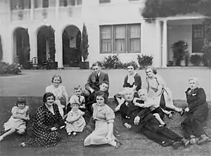 Lyons first fell pregnant a few months after her marriage, but miscarried just after her 18th birthday.[68] She suffered a second miscarriage the following year, and in her memoirs recounted having to watch on as a nurse threw the remains of the foetus into a bedside fireplace. She was told by doctors that she would never be able to have children,[69] but in fact went on to give birth to twelve – the first born when she was 19 and the last born when she was 36. Her subsequent pregnancies went relatively smoothly, with the exception of a third miscarriage in 1926; she had to carry the dead foetus for three months before it could be removed.[70] All but one of her children survived to adulthood, and all those who did out-lived her. Her son Garnet, born in 1924, died from meningitis at the age of 10 months.[71] Another son, Barry, was born with achondroplasia.[72]