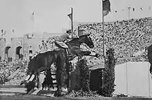 The jumping competition had 11 riders from 4 nations. While individual medals were awarded, none of the teams managed to have three riders finish the course so team medals were not awarded.[2] The 18-obstacle, 20-effort course was 1,060 meters in length, and included two fences at 1.60 meters, a very difficult wall, and a water that was 5 meters in width. 100,000 spectators were present at the show jumping competition.
