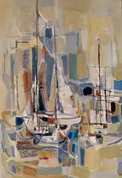 Originally influenced by Impressionism, Kalmık later became interested in European Cubism and was influenced by Braque, Picasso, Fernand Léger and Henri Matisse. After returning to Turkey he maintained an interest in figurative abstraction and developed a strong sense of pattern. During the 1960s many of his works featured fishermen and boats in front of abstract landscapes. Kalmik is known for his etchings as well as his prints. He also produced some public mosaics, including the fine one on a wall in 4.Levent, Istanbul. [2]