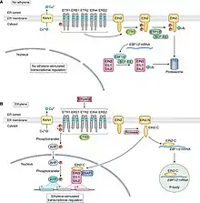 Ethylene binds to it specific transmembrane receptor present on the cell membrane of endoplasmic reticulum.[8][9] There are different ethylene receptor isoforms. Five isoforms are known in Arabidopsis thaliana which are named ethylene response/receptor 1 (ETR1), ethylene response sensor 1 (ERS1), ETR2, ERS2, and ethylene insensitive 4 (EIN4).[10] The ETR1 is similar (conserved sequence) in different plants but with slight amino acid differences.[11][12] A. thaliana receptors are classified into two subfamilies based on genetic relationship and common structural features, namely subfamily 1 that includes ETR1 and ERS1, and subfamily 2 that consists of ETR2, ERS2, and EIN4.[13] In tomato there are seven types of ethylene receptors named SlETR1, SlETR2, SlETR3, SlETR4, SlETR5, SlETR6, and SlETR7 (Sl for Solanum lycopersicum, the scientific of tomato).[14]