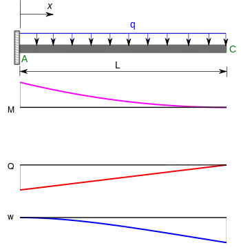 Another important class of problems involves cantilever beams. The bending moments (), shear forces (), and deflections () for a cantilever beam subjected to a point load at the free end and a uniformly distributed load are given in the table below.[5]