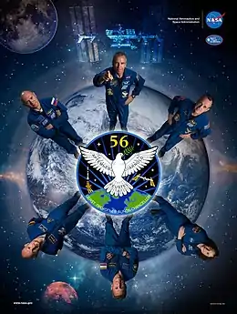 ![]() Expedition 56 mission patch ![]() (l-r) Artemyev, Feustel, Arnold, Prokopyev, Gerst, and Auñón-Chancellor | |