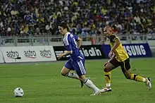 Torres made a scoring start to the 2008–09 Premier League season with a 25-yard shot into the bottom right-hand corner away at Sunderland, which was the only goal in a 1–0 win on 16 August 2008.[49] He suffered a hamstring tear in a 0–0 draw against Aston Villa, which would keep him out for two to three weeks.[50] Torres made his return in a 2–1 victory against Marseille in the Champions League and went on to score two goals in the Merseyside derby against Everton on 27 September 2008 to give Liverpool a 2–0 win.[51][52] He followed this up with another two goals the following weekend against Manchester City in a 3–2 win away at the City of Manchester Stadium as Liverpool came back from a two-goal deficit.[53] The first of these was the thousandth Liverpool goal to be scored in the Premier League.[54] Torres picked up a hamstring injury during a 2010 FIFA World Cup qualifier, meaning he was likely to miss three games for Liverpool.[55] On 22 October 2008, Liverpool played Torres' former club Atlético in the Champions League at the Vicente Calderón Stadium, but his injury meant he missed out on the game.[56] Atlético president Enrique Cerezo had given him a VIP invitation to watch the game, but he declined this to continue his rehabilitation from injury in Merseyside.[57] He was named in the FIFPro World XI team for the 2007–08 season on 27 October 2008.[58]