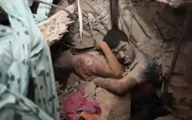 Final Embrace is a photograph showing two victims in the rubble of the April 2013 collapse of the eight storey Rana Plaza building in Savar Upazila, Bangladesh.[1] The photograph, taken by freelance photographer Taslima Akhter, was awarded third prize in the World Press Photo (single) in the "spot news category".[2][3][4][5] It was also selected among Time magazine's "Top 10 Photos of 2013".[6]