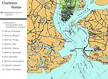 The defense also included shipping barriers spanning the harbor. First to be put in place was a row of piles that stretched from Fort Johnson to near Fort Ripley in the Middle Ground. This proved to be ineffective, as storms and strong tides soon ripped out major sections. Later, a "boom" was laid between Forts Sumter and Moultrie. Formed of 20-foot (6.1 m) lengths of railroad iron floated by large timbers, bound together by chains, and anchored at intervals, this barrier also broke under the strain imposed by the tides. It was supplemented by a rope obstruction that was meant to foul the propellers of enemy vessels. Despite the effort that went into these barriers, the defenders did not believe them to be serious impediments to an invading fleet. The same was true of most of the torpedoes (present-day mines) that were laid.[13] Du Pont was unaware of their flaws, so the barriers and torpedoes were major concerns in his preparations for the battle.[14]