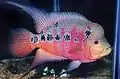 This variety originated slightly after the Kamfa, derived from the luohan. It has a rounded tail, large mouth, red protruding eyes, and a prominent head flower. Zhen Zhu means 'pearl flowerhorn'. This variety's strongest characteristic is pearling. Breeders often cross other types with Zhen Zhus because they breed easily and can create better pearling (flowerline) for the next generation. Weak tails can also carry over, however.[1]