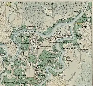 Topographical map of area around Fort van den Bosch (Ngawi), ca. 1845