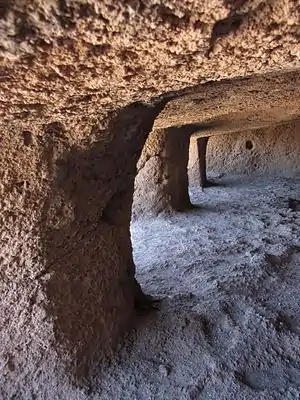 Other caves include the cueva de los Papeles ("the Papers' cave"), cueva de los Pilares ("the Pillars' cave"), cueva de la Audiencia ("the Audience cave") and the cantera de Molinos (quarry for grindstones). Most caves consist of a main central space with smaller rooms opening onto it. The caves were most likely shut off with dry stone walls. The main room may have been partitioned with light structures (for example of animal skins) or with stone alignments.[2]