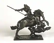 Abraham van der Doort's inventory of the collection of Charles I calls him "ffrancisco the one-eyed Italian".[6] The king had a St George and the Dragon and a Cupid on Horseback in black patination among 36 small bronzes in the cabinet room at Whitehall Palace.[8] George Vertue noted that the outstanding horseman and connoisseur of the riding academy, William Cavendish, first Duke of Newcastle at Welbeck, had a number of Fanelli's horse statuettes. John Pope-Hennessy has identified as Fanelli's a range of bronze statuettes of St. George and the Dragon and other equestrian subjects.[9] The tomb monument to Sir John Bridgeman and his wife in Ludlow church has been attributed to him.[10] Mary, Countess of Home had a cast of his "George".