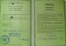 On the approach to the "republic", a border checkpoint with a boom barrier was built, over which the flags of the Wends and of the Anti-Nuclear-Sun were hoisted.[2] In the nearby information center, a Wends Passport (Wendenpass) could be issued, along with an entry stamp, for 10 Deutsche Marks. In the words of the occupiers, the passport was good "for the entire universe [...] so long as its owner could still laugh."[3]