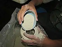 The English name reflects the historic use of the material for fulling (cleaning and shrinking) wool, by textile workers known as fullers.[1][2][3] In past centuries, fullers kneaded fuller's earth and water into woollen cloth to absorb lanolin, oils, and other greasy impurities as part of the cloth finishing process.