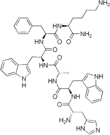Growth hormone-releasing peptide 6 (GHRP-6) (developmental code name SKF-110679), also known as growth hormone-releasing hexapeptide, is one of several synthetic met-enkephalin analogues that include unnatural D-amino acids, were developed for their growth hormone-releasing activity and are called growth hormone secretagogues. They lack opioid activity but are potent stimulators of growth hormone (GH) release. These secretagogues are distinct from growth hormone releasing hormone (GHRH) in that they share no sequence relation and derive their function through activation of a completely different receptor. This receptor was originally called the growth hormone secretagogue receptor (GHSR), but due to subsequent discoveries, the hormone ghrelin is now considered the receptor's natural endogenous ligand, and it has been renamed as the ghrelin receptor. Therefore, these GHSR agonists act as synthetic ghrelin mimetics.