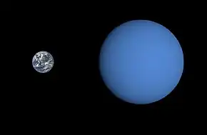 GJ 3470 b (occasionally Gliese 3470 b, formally named Phailinsiam[2]) is an exoplanet orbiting the star GJ 3470, located in the constellation Cancer. With a mass of just under 14 Earth-masses and a radius approximately 4.3 times that of Earth's, it is likely something akin to Neptune despite the initially strong belief that the planet was not covered in clouds like the gas giants in the Solar System.