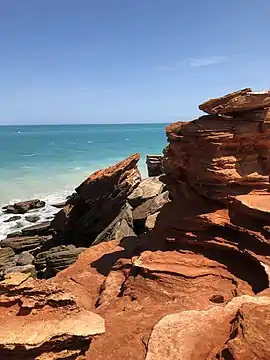 There are outcrops of Broome Sandstone, deposited in shallow water in this area in the Early Cretaceous period, about 130 million years ago. Footprints from dinosaurs of that time, and plant fossils, are preserved in the sandstone. At very low tide, dinosaur footprints can be seen about 30 metres (98 ft) out to sea.[2][3][4]