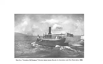 The General McPherson was a ship used by the U.S. military as a transport between military installations in the San Francisco Bay area. Named after Union General James Birdseye McPherson, a prominent figure in the American Civil War. The ship was the main mode of transport to Alcatraz Island during its function as a military defense and war camp after the ship was built in 1867. In addition to people is also carried military supplies and water.[1] A time schedule dated 1885 shows that it traveled between San Francisco, Fort Mason, the Presidio, Alcatraz Island and Angel Island twice a day and took 20 minutes to travel between Camp Reynolds and Washington Street Wharf.[1]