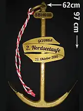 - Third Largest Single Coin (not a production run): It was handcrafted for the Geocaching event "Nordseetaufe 2010" in Germany. It weighs about 40 kilograms (88 lb) with a height of 97 centimetres (38 in) and a width of 62 centimetres (24 in). This macrocoin was built after the official event geocoin that has the shape of an anchor with a red and white rope. However it was not a run of a specific coins, but a coin that was made to resemble the coins that were made. It later had a coin number assigned to it. It remains the heaviest geocoin.