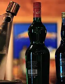 GET 27 (/dʒɛt/) is a liquor with mint used as an apéritif or in cocktails. The company was founded by Jean and Pierre Get in 1796. Production was in Revel, in the Lauragais. Trademarked in 1868 as Pippermint GET, the liqueur used peppermint oil imported from England rather than the locally-grown variety. The distillery remains in use, as the town’s cultural centre, but production moved to Gémenos and then to Beaucaire in 1995. The company is now part of Casanis, owned by Bacardi.[1] While its name refers to its original alcohol percentage, it currently has an alcohol content of 21%. Another product of the brand is the GET 31.[2]