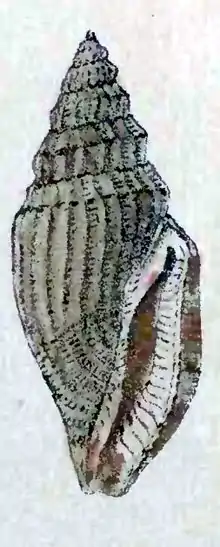 The shell is numerously narrowly and delicately longitudinally ribbed and is latticed by revolving striae. The shell is yellowish white, interruptedly narrowly brown-banded at the slight shoulder, and occasionally tinged with brown elsewhere.[2]