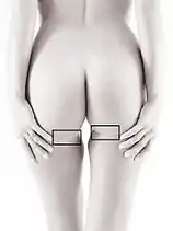The gluteal sulcus (also known as the gluteal fold, tuck, fold of the buttock, or horizontal gluteal crease) is an area of the body of humans and anthropoid apes, described by a horizontal crease formed by the inferior aspect of the buttocks and the posterior upper thigh.[1] The gluteal sulcus is formed by the posterior horizontal skin crease of the hip joint and overlying fat and is not formed by the lower border of the gluteus maximus muscle, which crosses the fold obliquely. It is one of the major defining features of the buttocks. Children with developmental dysplasia of the hips are born with uneven gluteal folds and can be diagnosed with a physical examination and sonogram.