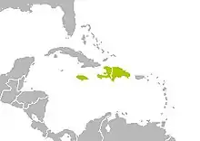 The golden swallow is native to the island of Hispaniola, and formerly Jamaica. The subspecies that resided in Jamaica, Tachycineta euchrysea euchrysea, is extinct. It was found up to elevations of 2,000 m (6,600 ft), from sea level on Jamaica, and currently found from 800 m (2,600 ft) on Hispaniola.[1] It is likely that this species, when not breeding, moves down to lower altitudes.[11] The estimated extent of occurrence for this swallow is 8,100 km2 (3,100 sq mi).[1] Primarily inhabiting hills of the interior of islands, this swallow prefers open country, but will occasionally be seen in forests and over towns.[11] It is restricted to patches of montane forest that consist primarily of Hispaniolan pine.[12] Never common in Jamaica, it was restricted to mountainous limestone country in the island's interior.[3]