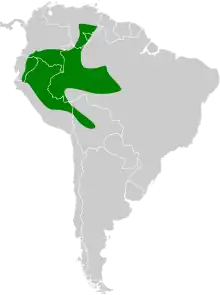 It is found in the western and central Amazon Basin in eastern Venezuela, Colombia, Ecuador, Peru, central Bolivia, and northwestern Brazil. Its natural habitats are subtropical or tropical moist lowland forests and subtropical or tropical swamps.