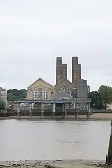 Coal was delivered by barge to the large coal jetty in the river, which stands on 16 Doric-styled, cast iron columns.[6] From 1927, the coal was then conveyed to then white-painted storage bunkers constructed on the west side of the station (following remedial work in 2013, the bunkers were coloured black).[1] After the transition to oil-fired operation, its cranes (previously also used for coal ash removal) were removed and the jetty was modified to allow fuel oil to be pumped ashore from river tankers.[1] However, the pier is now disused as any oil used at the station comes by road tanker.