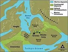 - ↑ Mutterlose, J.; Bornemann, A. (2000). "Distribution and facies patterns of Lower Cretaceous sediments in northern Germany: a review". Cretaceous Research. 21 (6): 733–759. doi:10.1006/cres.2000.0232.