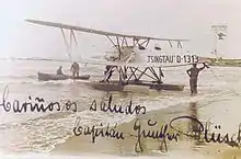 On November 27, 1927, Plüschow took the wooden two-masted cutter Feuerland to Punta Arenas, Chile. His engineer, Ernst Dreblow, brought his seaplane, a Heinkel HD 24 D-1313, aboard a steamer. By December 1928, the airplane had been fully assembled and the inaugural flight brought the first air mail from Puntas Arenas to Ushuaia, Argentina. In the months following, Plüschow and Dreblow were the first to explore by air the Cordillera Darwin, Cape Horn, the Southern Patagonian Ice Field, and the Torres del Paine of Patagonia. In 1929, Plüschow had to sell the Feuerland to obtain funds to return to Germany. There he published his explorations and photographs in a book, Silberkondor über Feuerland ("Silver Condor over Tierra del Fuego"), and a documentary film of the same name. The ship Feuerland was brought to Weddell Island and sailed between the islands of the Falkland archipelago until 2006, when she was transported back to Germany and listed as a historic cultural monument.[7]