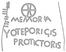 A memorial stone was discovered in 1895 near the church of Castell Dwyran in Carmarthenshire bearing a Christian cross and with inscriptions in both Latin and in ogham.[9] Dedicated to Voteporigis in the Latin inscription and Votegorigas in ogham, it was immediately assumed that this referred to Vortiporius. However, this assumption is refuted by modern linguistic analysis, which notes that the missing 'r' in the first syllable of 'Voteporigis'/'Votegorigas' is significant, and so the stone must be dedicated to a different person.[10]