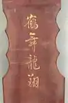 Other than the form and the duanwen of the qin, the qin player may marvel at the inscriptions at the back of the qin. These will be names, poems, dates of manufacture, seals and other artistic inscriptions. Of course, some qins have 'no name' on them, or are plain. Some think that there is no need to adorn the qin with written words, the sound should speak for itself. Most would just write the name and date inside the qin. However, carving inscriptions into the back of the qin is an art form in itself. It is a point of admiration to the qin, and collectors may add their own inscriptions on the qin, much like they would do to a piece of Chinese painting that they praise highly. Inscriptions can be used to date the qin as well, since most makers brush in their names and years of manufacture, mostly inside the soundhole, on the sound absorber or next to it. A calligrapher may be called in to compose a piece and that will be copied onto the qin.