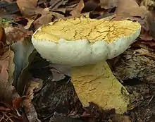 Although there are a few lookalike species with similar overall appearance, in the field, Gyroporus cyanescens is typically readily recognized by its characteristic straw-yellow color and nearly instantaneous dark blue bruising. G. phaeocyanescens is smaller, with a dull brownish-yellow cap. Although its flesh has a bluing reaction to injury, its yellow pore surface does not. It has larger spores, measuring 9–15 by 5–7 µm. G. umbrinosquamosus, found along the Gulf Coast of the United States, is similar in appearance, but lacks the bluing reaction.[10] Newly described from China in 2003, G. brunneofloccosus closely resembles G. cyanescens, and was frequently confused with that species. It has a smaller fruit body, with a brownish cap up to 8 cm (3.1 in) in diameter. Its staining reaction involves a change from light turquoise to dark turquoise or dark blue. Its spores are 5–8.5 by 4–5.3 µm.[15] Suillus tomentosus has brownish pores that undergo a slower blue staining reaction.[11] If the fruit bodies are not uprooted and only the top of the cap is examined, G. cyanescens can be confused with young Russula fellea mushrooms.[16]