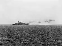 Eagle disembarked all of her aircraft, except for her four Sea Hurricanes, to make room for 31 Spitfires and flew them off on 3 June during Operation Style. Another 32 were flown off on 9 June during Operation Salient. Later in the month, the ship provided air cover for another convoy, Operation Harpoon, which departed for Malta at the same time as the Operation Vigorous convoy did, from the opposite direction. A dozen Sea Hurricanes of 801 Squadron and four Fulmars from 807 Squadron reinforced the four Sea Hurricanes of 813's Fighter Flight to deal with the heavy air attacks anticipated.[69] The convoy was subject to heavy air attacks by both the German and Italian Air Forces; Eagle's Sea Hurricanes managed to disrupt many attacks, claiming nine aircraft destroyed and a further two probably destroyed for the loss of one Sea Hurricane from 813 Squadron and three Fulmars.[70] The escorts reached Gibraltar on 17 June and did not make the next delivery of aircraft until 14 July when 32 Spitfires were flown off to Malta (Operation Pinpoint). During this time, the carrier's aircraft complement consisted solely of six Sea Hurricanes of 801 Squadron. Another 29 Spitfires as well as four Swordfish of 824 Squadron were loaded on 20 July and the Spitfires were flown off the following day.[71] Earlier in the day, the ship was unsuccessfully attacked by the Italian submarine Dandolo.[72]