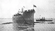 Erin originally was ordered by the Ottoman Empire on 8 June 1911,[10] at an estimated cost of £2,500,000, with the name of Reşad V[2][11][12] in honour of Mehmed V Reşâd, the ruling Ottoman Sultan,[13] but was renamed Reşadiye during construction.[Note 3] She was laid down at the Vickers shipyard in Barrow-in-Furness on 6 December 1911 with yard number 425, but construction was suspended in late 1912 during the Balkan Wars and resumed in May 1913.[10] The ship was launched on 3 September and completed in August 1914.[11] After the assassination of Archduke Franz Ferdinand on 28 June, the British postponed delivery of Reşadiye on 21 July, despite the completion of payments and the arrival of the Ottoman delegation to collect Reşadiye and another dreadnought battleship, Sultan Osman I, after their sea trials.[14] Churchill ordered the Royal Navy to detain the ships on 29 July and prevent Ottoman naval personnel from boarding them; two days later, soldiers from the Sherwood Foresters Regiment formally seized them and Reşadiye was renamed Erin, a dative name for Ireland.[15] Churchill did this on his own initiative to augment the Royal Navy's margin of superiority over the German High Seas Fleet and to prevent them from being acquired by Germany or its allies.[16][17]