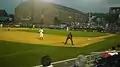 View of the infield in May 2007, with the Portland Exposition Center in the background. Clay Buchholz is the pitcher