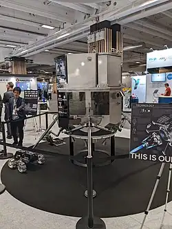 The Hakuto-R lander was measured at 2.3 metres (7.5 ft) tall by 2.6 metres (8.5 ft) wide, with a total weight of approximately 1,000 kilograms (2,200 lb) with its payload and fuel.[5] To perform a stable landing, the lander was equipped with four landing legs and a main thruster.[5]