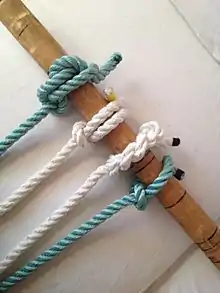 Studding-Sail Bend[2] is a way to attach the end of a rope at right angle to a cylindrical object such as a beam.