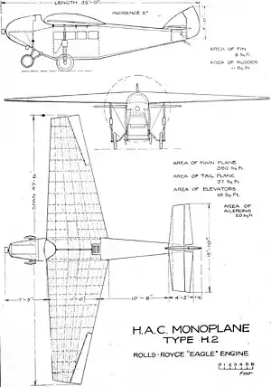 The H.2 was designed to be powered by a 360 hp (270 kW), water-cooled V-12 Rolls-Royce Eagle IX engine mounted in the nose,[2][3] though the only completed prototype had a 350 hp (260 kW) Eagle VII because of Handasyde's limited finances.[4] Its honeycomb radiator was mounted underneath the cowling between the forward undercarriage struts. Behind the engine the fuselage was flat-sided and deep, with the pilot in an open cockpit recessed into the wing leading edge. The passenger cabin was behind the pilot and under the wing, entered by forward doors on each side. There were three seats on each side, each with a window; the cabin had a forward space for luggage and a toilet at the rear. In an emergency passengers could escape through a roof trapdoor at the wing trailing edge.[2][3]