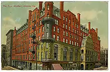 When the hotel was completed, Kimball turned his efforts toward improving the surrounding area. The area of Atlanta bounded by Pryor, Decator, Lloyd, and Alabama Streets was home to a decrepit railroad car shed.[2] Another area known as the "Mitchell heir property" was reclaimed by the heirs of Robert Mitchell under protest of the government after the railroads abandoned the land.[2] The city claimed that it had a right to the land since it was originally traded for a different property.[2] Kimball, seeing the detriment to his own property by these other lands, paid the city for the lands and built a new rail depot.[2]