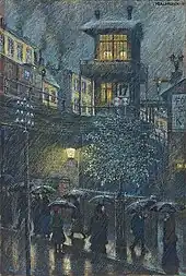 The main period of Bakluschek's artistic development began in 1894 and extended for two decades, until the beginning of World War I in 1914. Baluschek identified with opposition to traditional representative art and forged relationships with artists in the circle dominated by impressionist Max Liebermann (later classified by the Nazis as a practitioner of "degenerate art"). Baluschek's paintings from this period show life on the outskirts of Berlin, where construction of factories, apartment complexes and railroads was booming. His favorite themes included factories, cemeteries and above all the common working people of Berlin. For example, his 1894 work Noon (Mittag) depicts women with children bringing lunch baskets to their men employed at the factories, and evokes the "endless drudgery" of working-class life, with its constant repetition of daily tasks.[3] With Railwayman's Evening Free (Eisenbahner-Feierabend) in 1895, this theme is represented by an individual worker who returns exhausted from work against a backdrop of railroad installations, smoke stacks and overhead tram wires, and is greeted by anxious children.