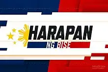Harapan ng Bise (lit. 'Faceoff of the Vice [Presidents]') also known as Harapan ng Bise: The ABS-CBN Vice Presidential Debate was a televised debate organized and broadcast by ABS-CBN on April 17, 2016. The debate is not part of the Commission on Elections-organized PiliPinas Debates 2016. The debate was moderated by ABS-CBN News journalists Alvin Elchico and Lynda Jumilla,[1] with Gretchen Ho as the social media correspondent. Veteran news anchor Tina Monzon-Palma and political analysts Edna Co and Julio Teehankee served as the debate panelists.[1]