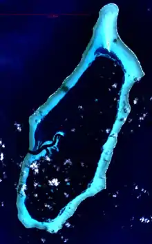 Helen Island was discovered by the Spanish naval officer Felipe Tompson in 1773, who charted it as San Felix shoal.[6] The only island of the reef, it is located near its northern tip. It is tiny in comparison to Helen Reef, about 20 to 40 m wide and 400 m long, or about 0.03 km² of land area. The densely wooded island sits atop a sand dune, which is 0.25 km² in extent and which is moving southeast, falling into the lagoon, at a rate 3 to 4 m per year. The island is uninhabited except for a marine ranger station of Hatohobei State, which was established in the early 1990s on the eastern side of the island, to guard the reef against foreign poachers. The station is permanently occupied by a staff of three.