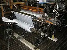 The plain Hattersley Domestic Loom was specially developed for cottage or home use and designed to replace the wooden handloom; the Domestic is similar in construction to a power loom. It was introduced ca.1900 and the makers claimed that a speed of 160 picks per minute could be easily attained with from 2 to 8 shafts weaving a variety of fabrics. Because foot pedals, or treadles, operate the loom it is still classed as a handloom, but it is much easier and faster to weave as all the motions of the loom are connected via crankshaft and gear wheels. The cast metal chair, manufactured along with the loom, can be raised or lowered to suit, and the seat rocks forward and back as the weaver treadles the loom.[1] There is an example in the Bradford Industrial Museum.