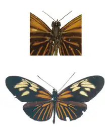 Adult H. eratosignis are distinguished morphologically from their sister species Heliconius demeter because they lack a yellow streak on the base of the forewing costa underside;[2] in contrast, H. eratosignis has a solid orange basal costal margin on the underside of the forewing. Keith S. Brown and Woodruff W. Benson in 1975 argued the two forms were the same species, but recorded both H. eratosignis gregarious and H. demeter solitary larvae in their paper.[3] The Tree of Life Web Project has yet to recognize H. eratosignis as a separate species, but shows an image of a male Heliconius eratosignis from Peru under the description of H. demeter.[4]