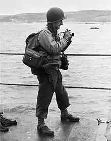 Though severely injured, Wall held onto his 35mm Leica camera. His tenacity very well may have been the thing that kept him alive, along with his khaki uniform sealing his wounds.[5] In the pre-operative tent, Wall spoke with the medical officer, Captain Joseph Aprile, who was attempting to save his life, saying the film from his camera needed to get back to headquarters. Finally being assured this would happen, he released the film. The Army Pictorial Service in London received, processed and distributed these photos, the greatest number of pictures released by a single photographer on D-Day.[6][7][8]