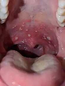 Herpangina, also called mouth blisters, is a painful mouth infection caused by coxsackieviruses. Usually, herpangina is produced by one particular strain of coxsackie virus A (and the term "herpangina virus" refers to coxsackievirus A),[1] but it can also be caused by coxsackievirus B or echoviruses.[2] Most cases of herpangina occur in the summer,[3] affecting mostly children. However, it occasionally occurs in adolescents and adults. It was first characterized in 1920.[4]